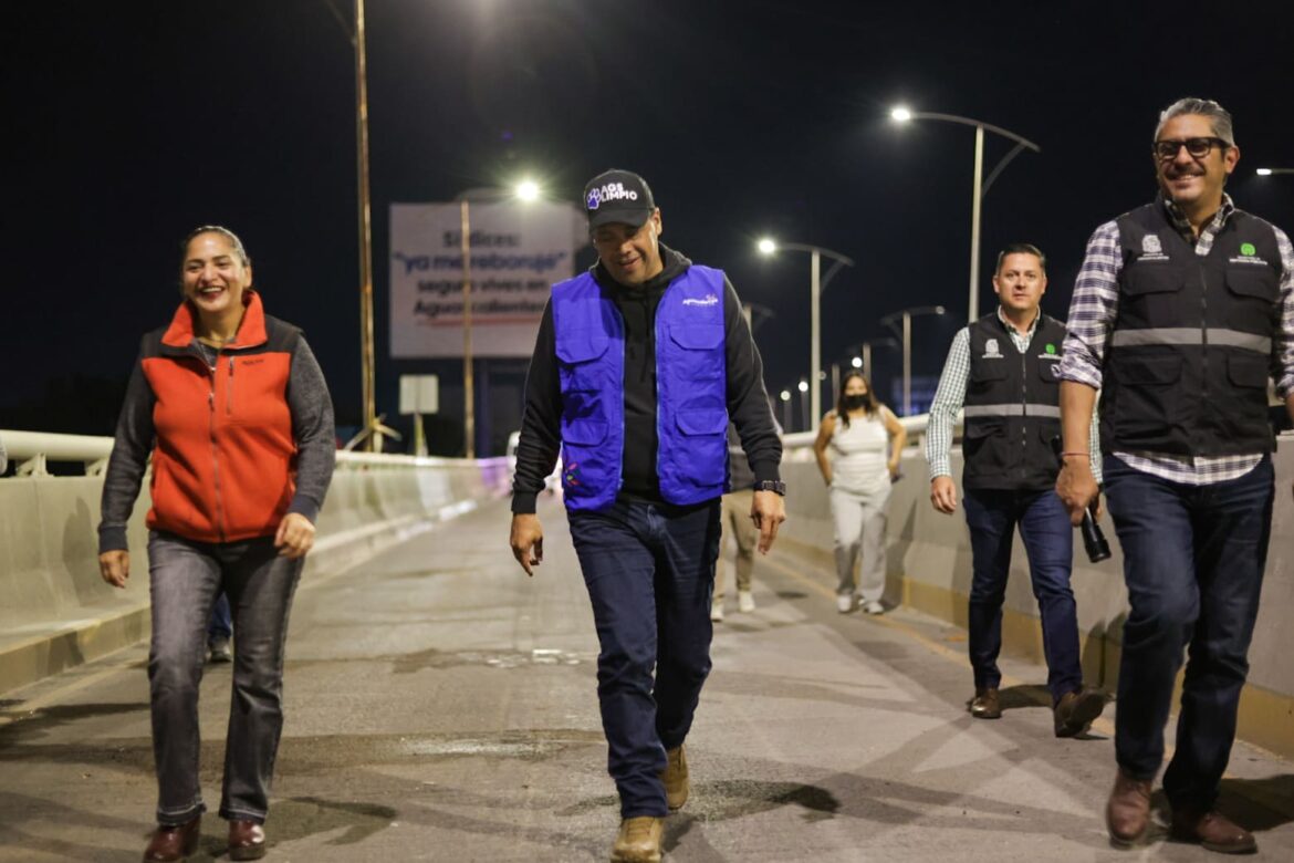 Aguascalientes, Ags.-Con el firme propósito de mantener vialidades seguras y funcionales, el presidente municipal Leo Montañez encabezó un recorrido de supervisión en el operativo nocturno de limpieza integral por el puente elevado de Segundo Anillo Sur, en su intersección con Blvd. a Zacatecas.